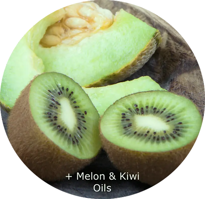 Melon is a vitamin-rich antioxidant with omega fatty acids, repairing, rejuvenating, and moisturizing the skin, while Kiwi, packed with nutrients and vitamin C, soothes the skin with refreshing restorative properties.